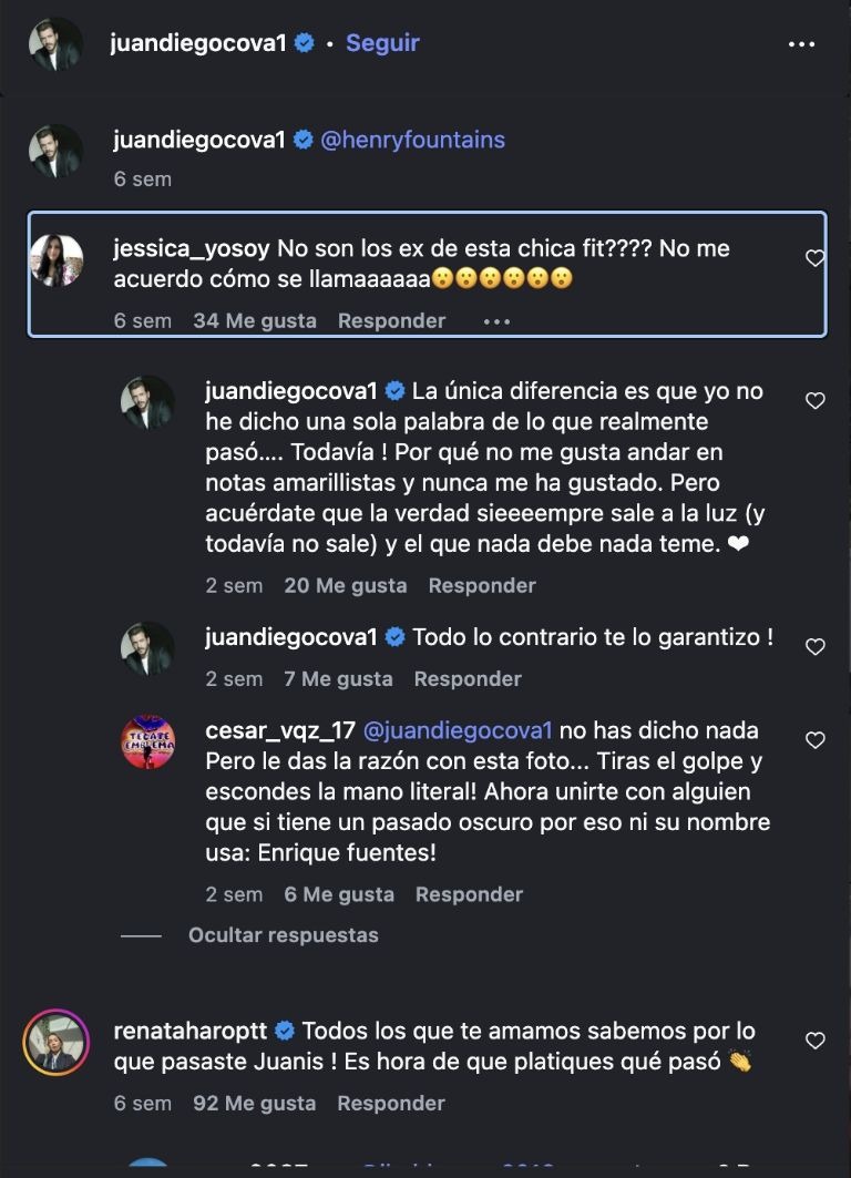 “La única diferencia es que yo no he dicho una sola palabra de lo que realmente pasó… ¡Todavía! El que nada debe nada teme y la verdad sieeeempre sale a la luz”, escribió el actor, sugiriendo que él tiene su propia versión de los hechos que podría cambiar la narrativa. Juan Diego Covarrubias ni las autoridades, han revelado que esto sea verdad, por lo que su inocencia se mantiene a pesar de los videos virales. Por su parte, Enrique Fuentes puso su cuenta de Instagram privada y no ha declarado nada.