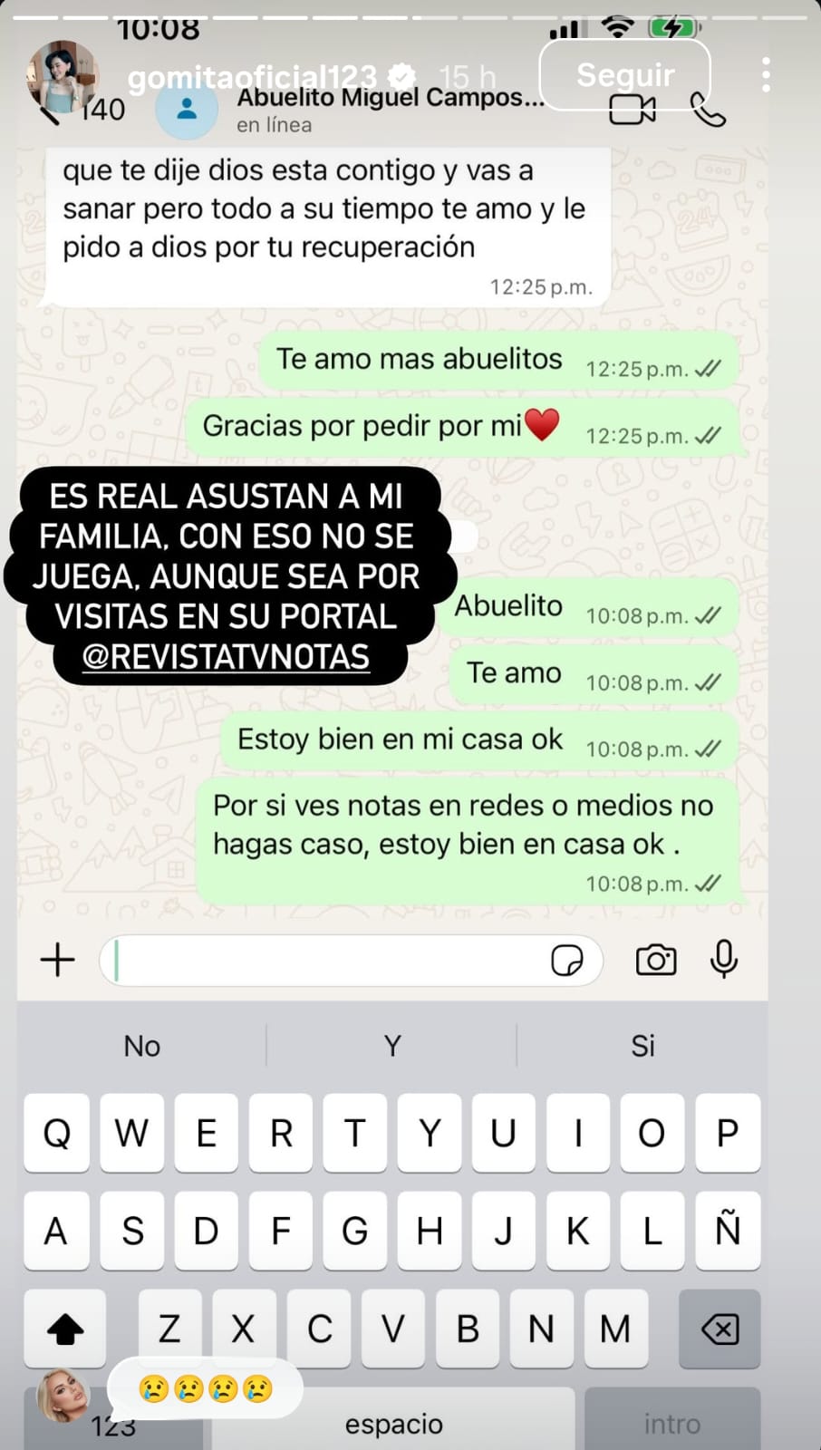 "Qué horror que saquen una noticia así de horrorosa por vistas", sentenció la influencer, visiblemente molesta por la falta de ética profesional. Pero lo que más le dolió a la famosa influencer no fue el chisme, sino el daño colateral en su círculo más íntimo. Gomita compartió una captura de pantalla de WhatsApp donde se ve la angustia de su abuelo al leer la noticia.