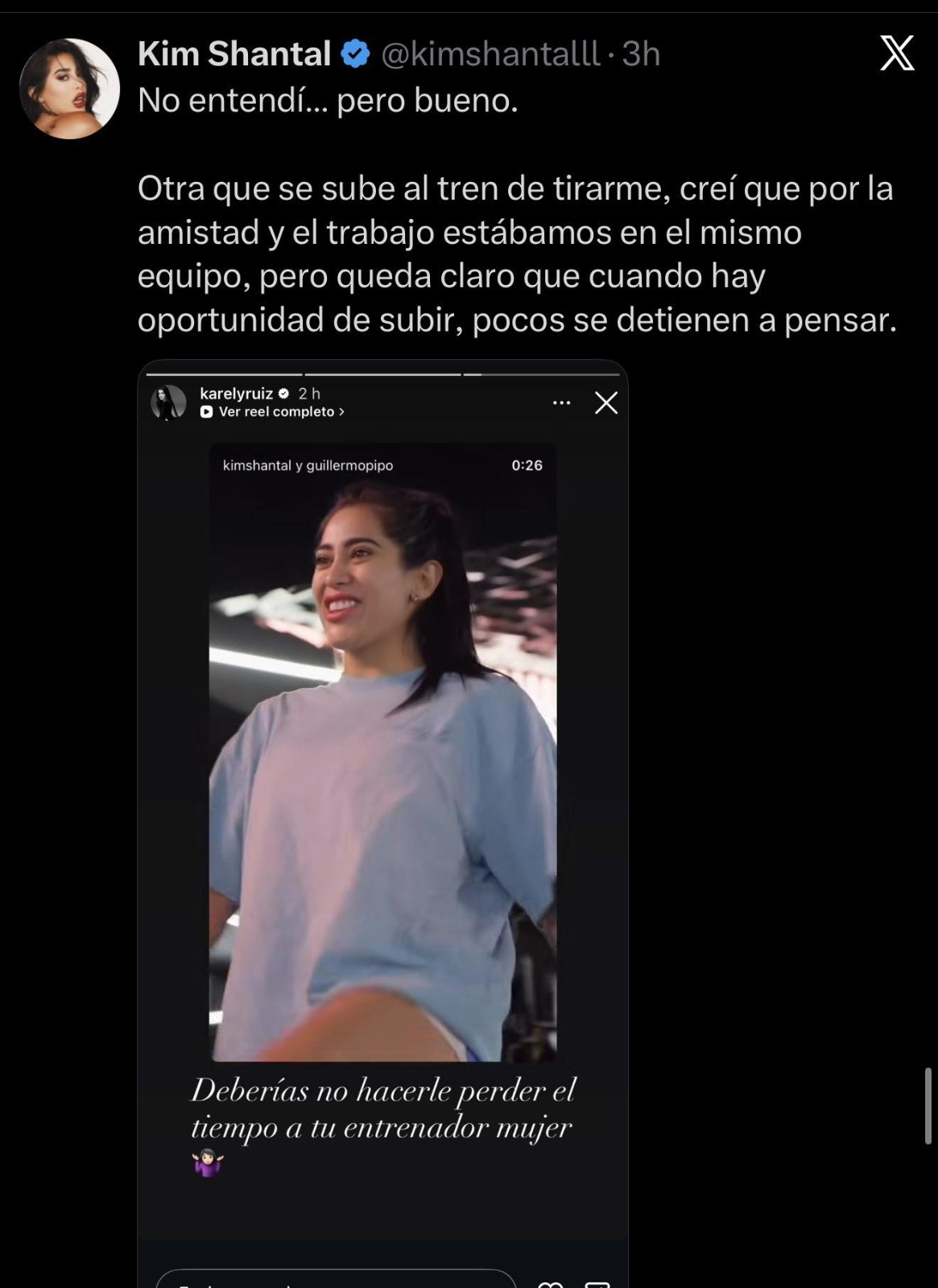 Cuando el nombre de Karely Ruiz comenzó a sonar como la posible rival de último minuto, nadie imaginó que la regiomontana entraría 'pateando la puerta'. Sin previo aviso, la estrella de 'Only Fans' publicó un video de Kim Shantal entrenando, pero con un mensaje que nos dejó fríos: "Deberías no hacerle perder el tiempo a tu entrenador, mujer". ¡Zas! La crítica al desempeño físico de Kim fue un gancho directo al hígado.