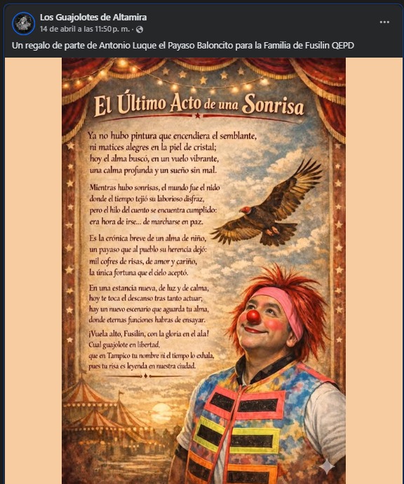 La familia del entrañable payaso 'Fusilín' ha abierto las puertas de su dolor para que la comunidad pueda despedirlo como se merece. Los servicios funerarios iniciaron este 13 de abril en el Velatorio del IMSS en Tampico, ubicado en la Avenida Manrique de la colonia Colinas de San Gerardo.