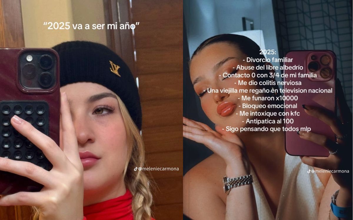 Recientemente, Melenie se sumó al popular trend de fin de año en TikTok, donde los usuarios enlistan los eventos negativos para dejarlos atrás. Su lista fue una radiografía cruda de su tormentoso 2025. Entre sus confesiones más fuertes, la influencer escribió: "Divorcio familiar", "Abusé del libre albedrío", "Contacto cero con mi familia", "Me dio colitis nerviosa", "Una viejilla me regañó en televisión nacional (Pati Chapoy)", "Me funaron" y "Bloqueo emocional".