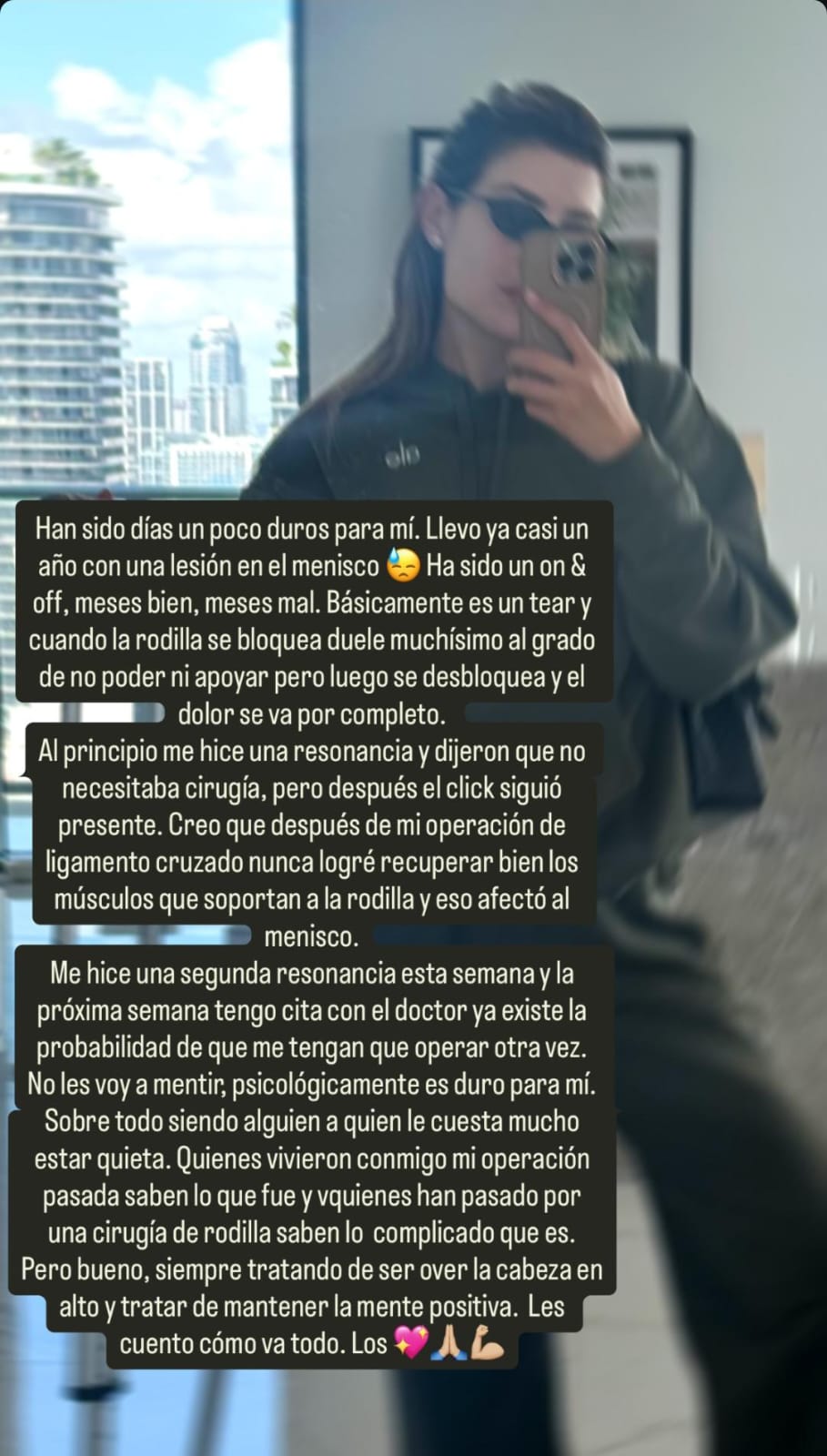 La lesión es un "tear" (desgarro) que, en los peores momentos, provoca que la rodilla "se bloquee". Cuando esto sucede, el dolor es tan intenso que le impide siquiera apoyar la pierna, lo que la ha llevado a usar muletas públicamente. La influencer recordó que este problema podría ser una secuela de una cirugía anterior de ligamento: "Creo que después de mi operación de ligamento cruzado anterior nunca logré recuperar bien los músculos que soportan la rodilla y eso afectó al menisco.”