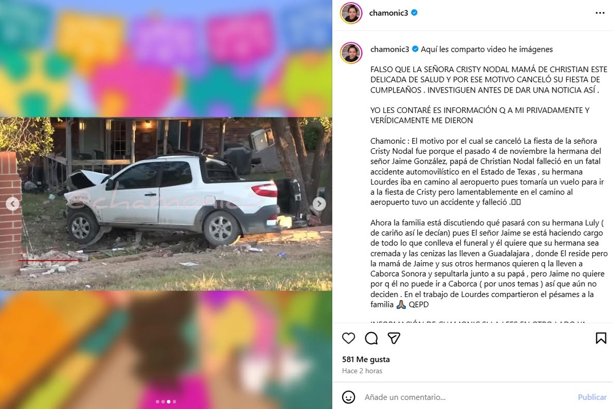 La noticia fue difundida a través de un mensaje exclusivo a la cuenta de Instagram de la comunicadora Jaqueline Martínez, conocida como 'Chamonic'. El fallecimiento de Hilda Lourdes González Terrazas, tía de Christian Nodal y hermana de su padre, Jaime González, ocurrió el pasado 4 de noviembre de 2025 en el Estado de Texas.