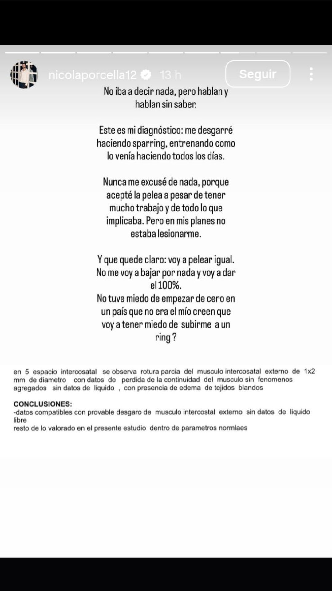 “Este es mi diagnóstico: me desgarré haciendo sparring, entrenando como lo venía haciendo todos los días. En el quinto espacio intercostal se observa rotura parcial del músculo intercostal externo de 1x2 mm de diámetro con datos de perdida de la continuidad del musculo sin fenómenos agregados sin datos de liquido, con presencia de edema de tejidos blandos”, explicó y lo acompañó con una fotografía de los estudios médicos realizados.