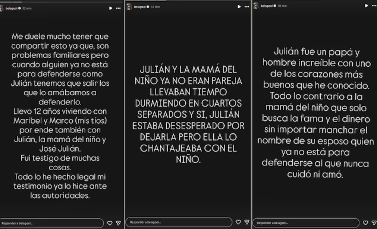 "Julián estaba desesperado por dejarla... Ella solo busca fama y dinero sin importar manchar el nombre de su esposo, quien ya no está para defenderse", escribió en sus historias de Instagram. Maribel García lamenta que el escándalo suceda tras la muerte de Julián, quien ya no está para hablar de viva voz y para dar su versión de los hechos. Es por esto que ella ha salido a dar la cara por su primo.