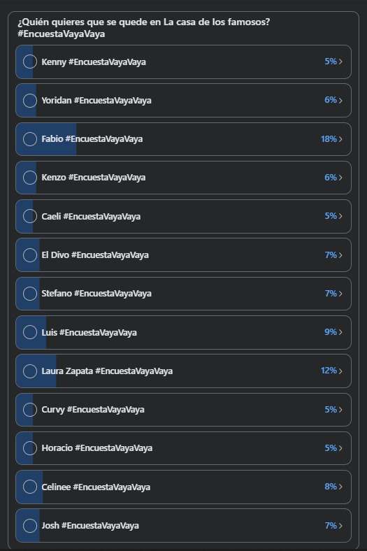De acuerdo a 'Vaya, Vaya', los dos participantes más queridos y quienes se quedarán son Fabio con 18% y Laura Zapata con el 12%. Los participantes que están en un punto medio son Luis con el 9% y Celinee con el 8%. Hay otros participantes con porcentaje muy bajo, tal es el caso de Kenny, Caeli, Curvy y Horacio con el 5%. Si las encuestas son verdaderas, uno de los últimos cuatro concursantes mencionados, podría ser el octavo eliminado del próximo lunes.